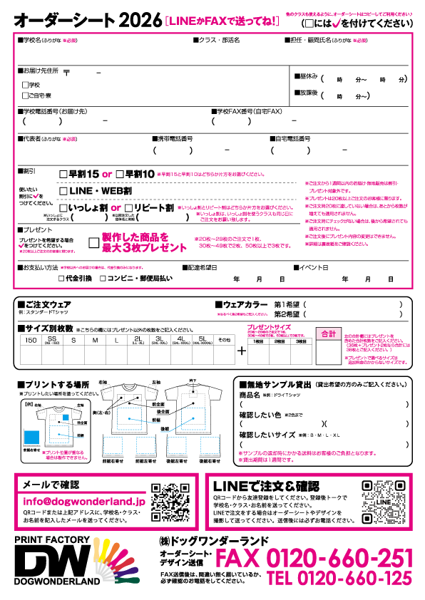 学校からFAXで注文をしなければいけない場合、お手元にカタログが無い方は下記リンクよりオーダーシートをダウンロードして頂き、プリントアウトしてご利用ください。また、1人ずつ違う背ネームや背番号をプリントをする場合に使う、お名前・番号記入用紙もダウンロード可能です。