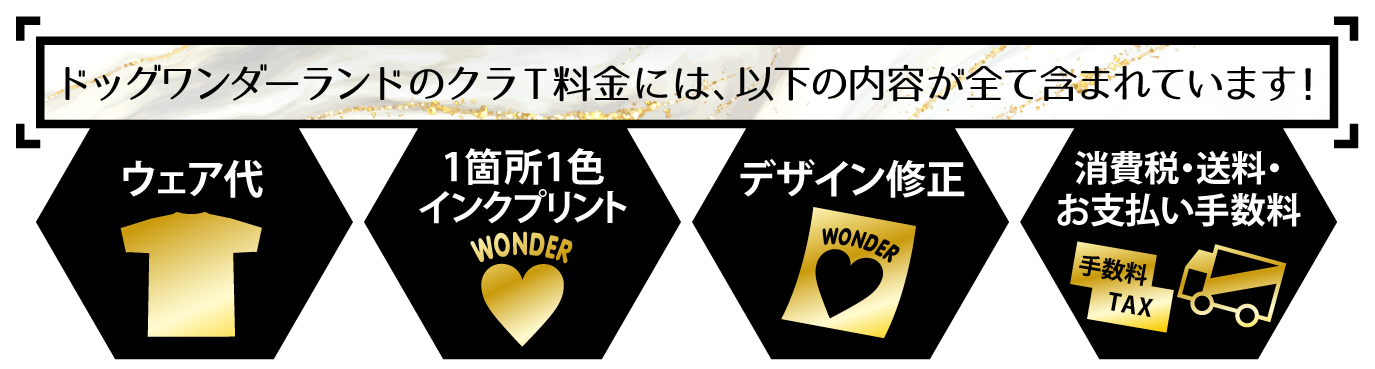 ドッグワンダーランドは料金以外でもクラT作りを徹底サポート。クラスTシャツ作りで心配だったり面倒くさかったりする事ができるだけ無くなるように、学生の皆さんの負担ができるだけ少なくなるように、色々なサービスを用意して徹底サポートします!