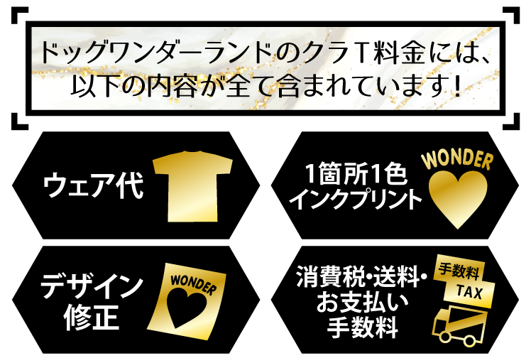 ドッグワンダーランドは料金以外もクラT作りを徹底サポート。クラT作りで心配だったり面倒くさかったりする事ができるだけ無くなるように、学生の皆さんの負担ができるだけ少なくなるように、色々なサービスを用意して徹底サポートします!