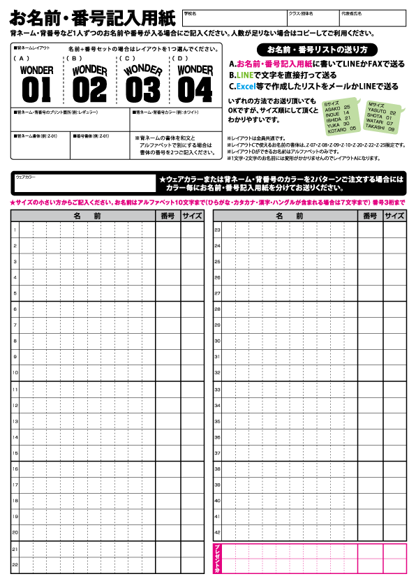 学校からFAXで注文をしなければいけない場合、お手元にカタログが無い方は下記リンクよりオーダーシートをダウンロードして頂き、プリントアウトしてご利用ください。また、1人ずつ違う背ネームや背番号をプリントをする場合に使う、お名前・番号記入用紙もダウンロード可能です。
